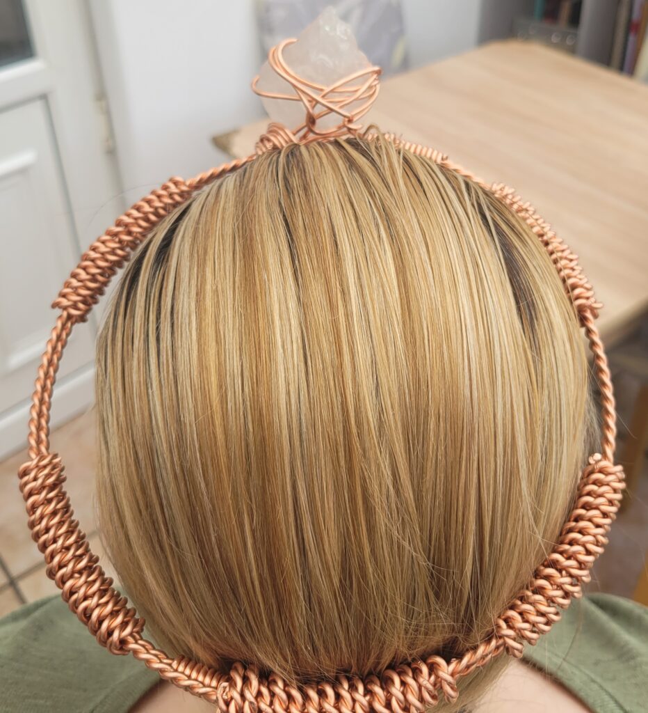 At the front of the crown sits a natural quartz crystal, securely wrapped in copper wire and positioned over the forehead area. Quartz crystals are widely known for their ability to amplify and focus energy. When placed at the front of the crown, the crystal aligns with the third eye area, which in many spiritual traditions is associated with intuition, inner vision, and heightened awareness.